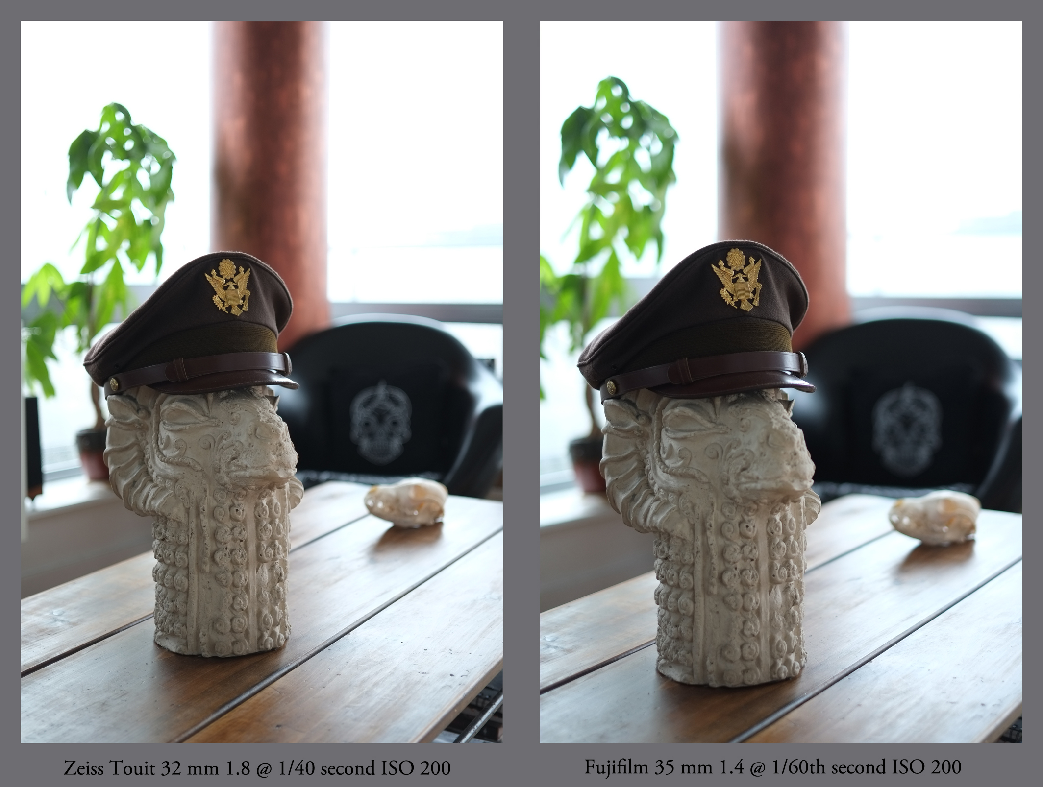 So I conducted a test by putting the camera on my trusty Oben carbon fiber tripod and shooting this still life in my apartment between the two lenses. I have uploaded a very large image so feel free to pixel peep. Also please feel free to comment which of the two lenses produced the look you like the most. Me, I have to say I love more blur that is attainable with the Fujifilm 35 1.4, but the 9 blade aperture on the Zeiss certainly does have a smooth and pleasant blur. Notice the harder edges of the green plant in the back ground as well as the embroidered skull. I do like the slightly wider field of view on the 32 mm. I also notice a color shift between the two lenses. I had a Lastolite 30″ 5 in 1 silver gold reflector off to camera right acting as a warm fill. The Fujifilm 35 mm seemed to