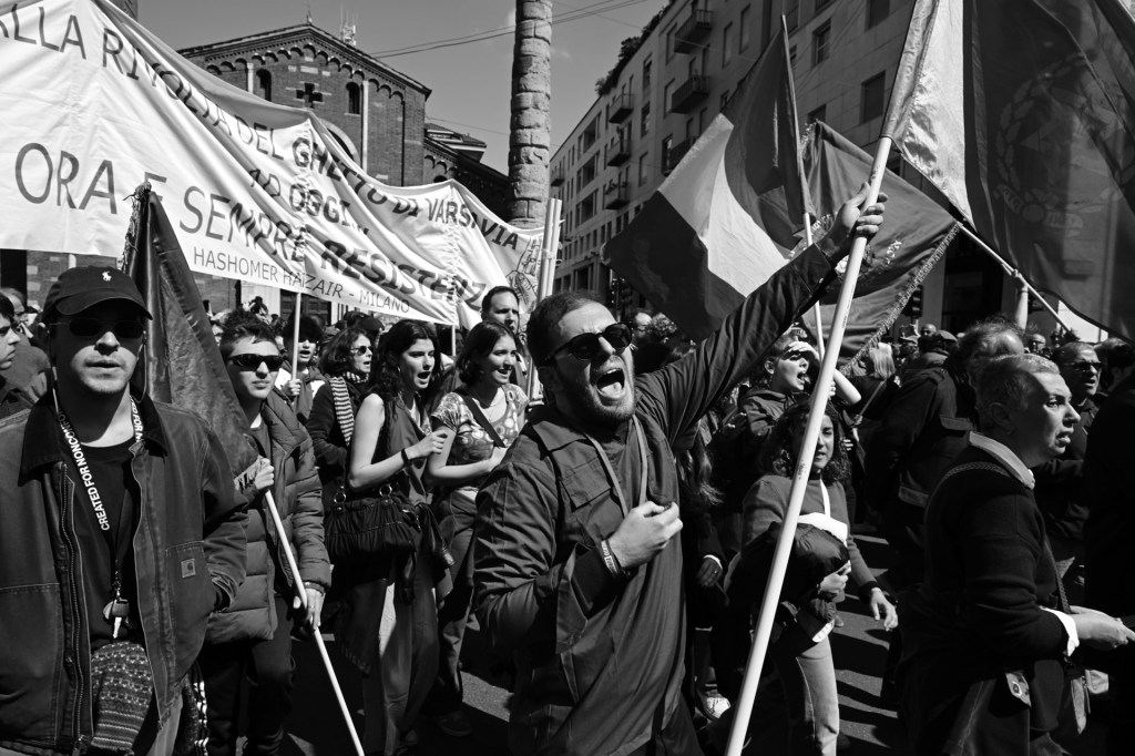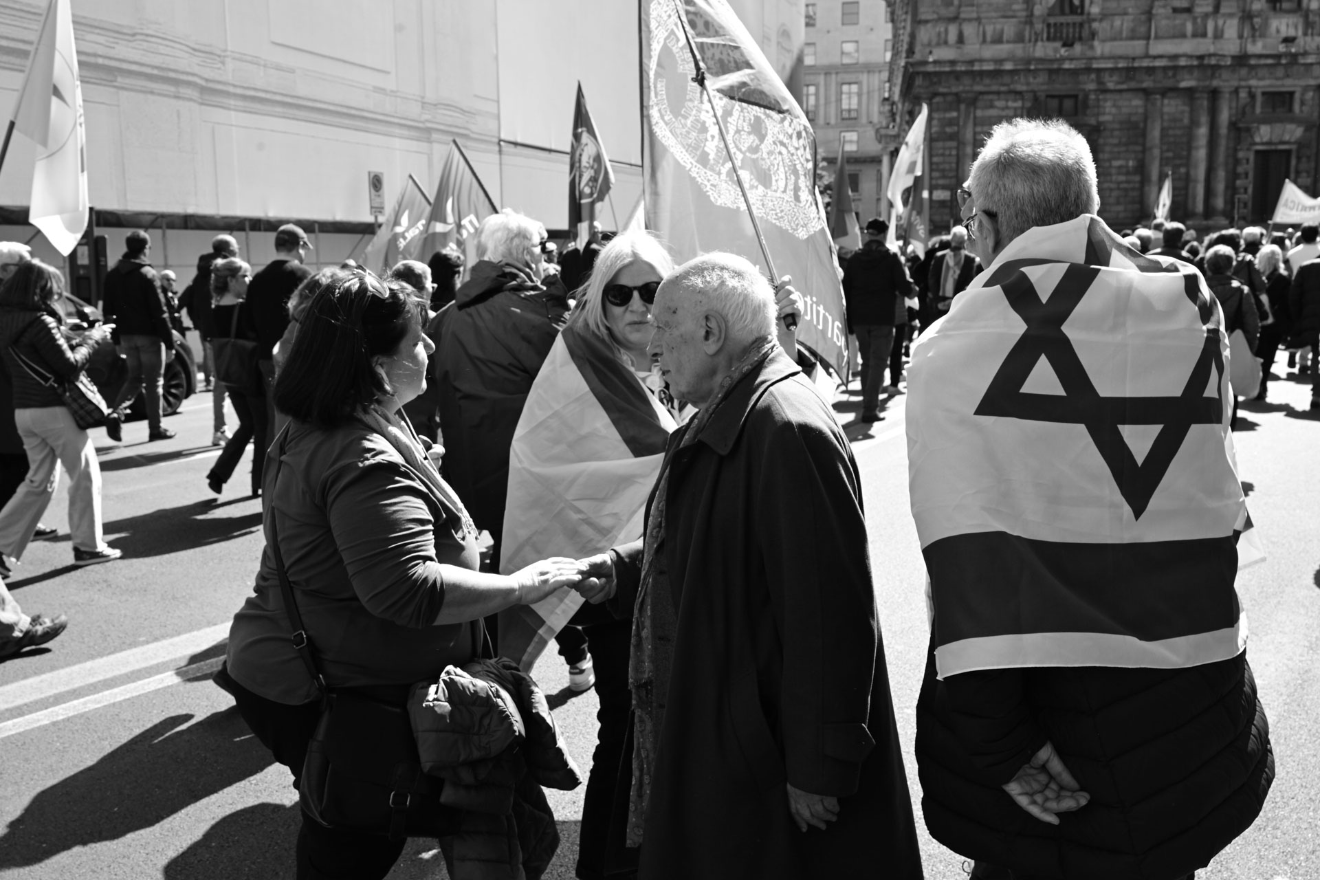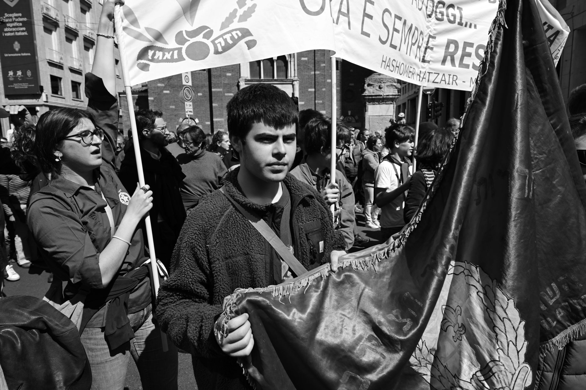 We emerged from the Milan Subway at the start of the parade among throngs of shouting Italians celebrating the release from the grips of the Nazis, complete with many signs and symbols of various Italian political parties. We broke into small groups and inserted ourselves into the fray, me, with a tall So Cal/Arizona photographer and Klaus, an older German photographer from Munich. As chance would have it, we started to walk the route of the parade among the “Brigata Ebraica” or Jewish Brigade. This fit me well as a contrary element of pro Palestinians were expected. I asked my fellow photographers to pull me out of the conflict if it erupted as I have little sympathy for Hamas or those who support their agenda. (I stand with my Jewish brothers and sisters). I didn’t want to get into a fight, my goal was to document.