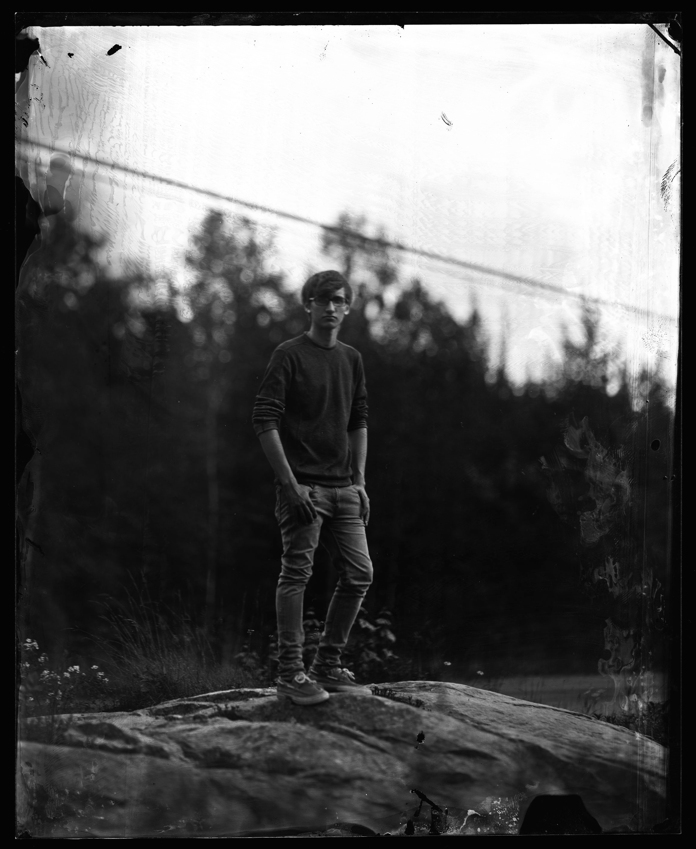 Aside from learning the wet plate technique I got to cover some new ground. Because the class attracted seemingly eccentric and cool devotees I got to practice 8×10 Portraiture. I really cannot take a photo of a mundane person; I need some style or something strong inside a person to capture. It had been bugging me, how do you capture a person with an 8×10 view? Doesn’t the camera and film holder come between you and your subject? Square up camera, focus, place subject, compose, focus again, hold really still, insert film holder, and make exposure. Daunting right? I worked through it, I asked my subjects some thing cheesy but effective, I asked them to hold really still and look into the lens while telling the camera a secret, using telepathy of course. The results on several were quite compelling. Brenton Hamilton’s portrait is a favorite of mine. Photographic opportunism presented itself when Joyce Tenneson paddled up in a kayak to where we were set up on Day 4. Once again, that creative cauldron of Maine Media Workshops tests you, makes you “go up levels”.